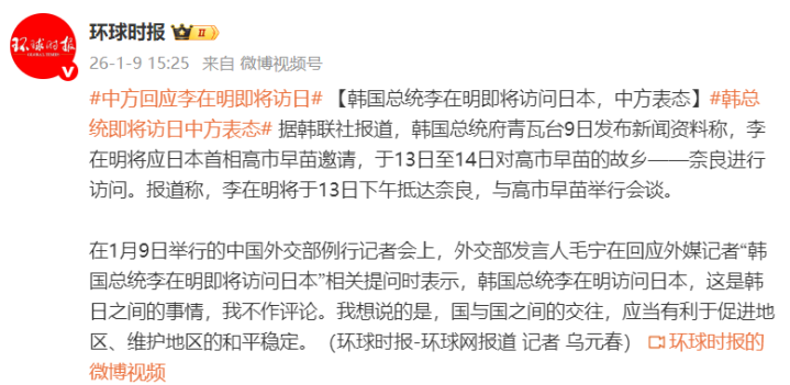 在1月9日举行的中国外交部例行记者会上,外交部发言人毛宁在回应外媒记者“韩国总统李在明即将访问日本”相关提问时表示,韩国总统李在明访问日本,这是韩日之间的事情,我不作评论。我想说的是,国与国之间的交往,应当有利于促进地区、维护地区的和平稳定。