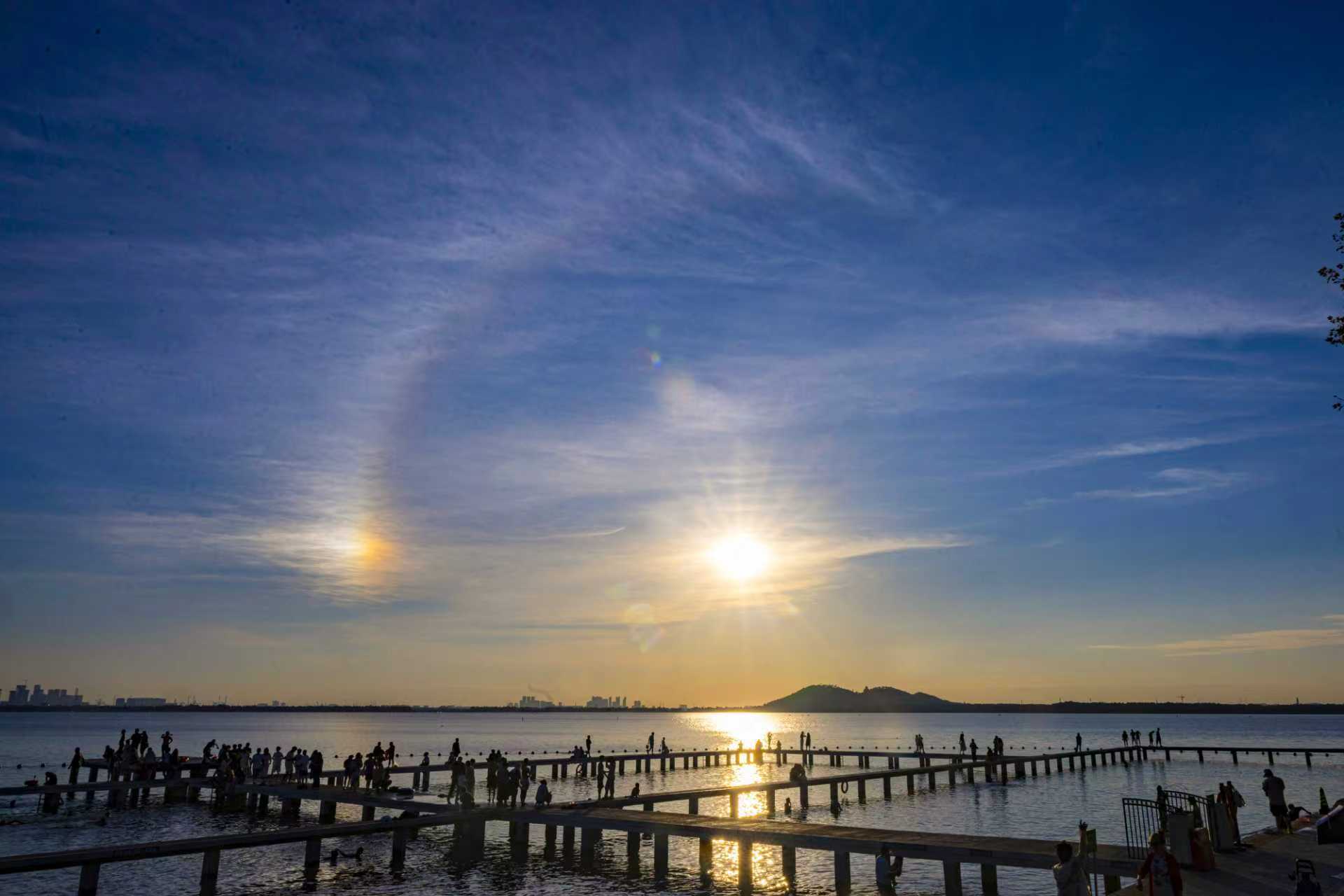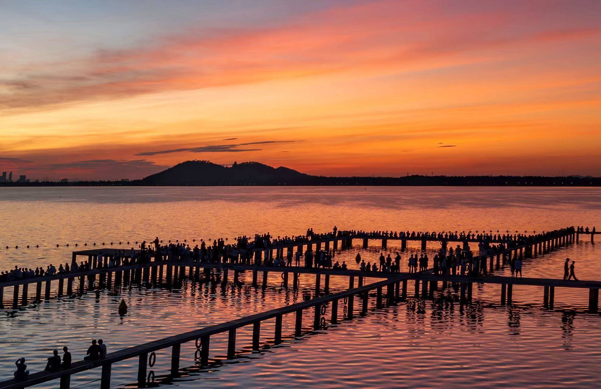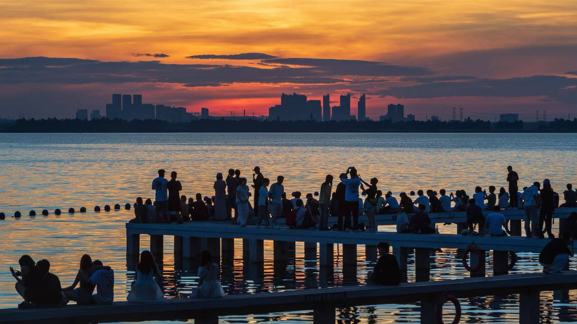 有网友记录了今夏来凌波门看“世纪朝霞”的感受:4时50分左右,先是天际线裂开一道金光,之后它像是被点燃的火焰,红的、橙的、粉的、金的……整片天空都在“燃烧”,湖水也被染成橘子海,手机拍不出它万分之一的美……5时30分,耳边的鸟鸣声逐渐清晰,湖畔开始冒出晨跑的人、踩水的小孩子……