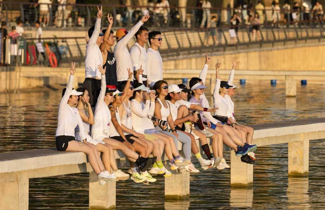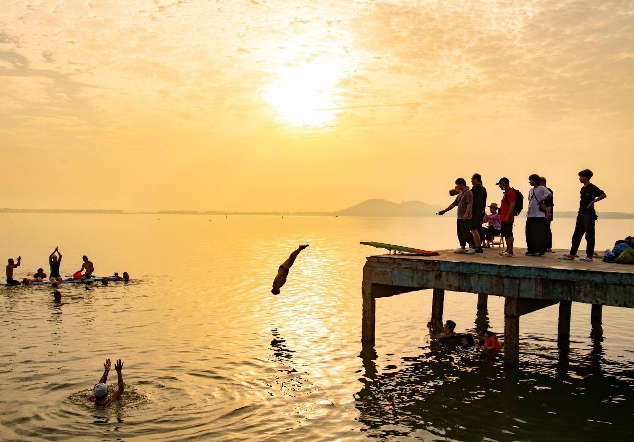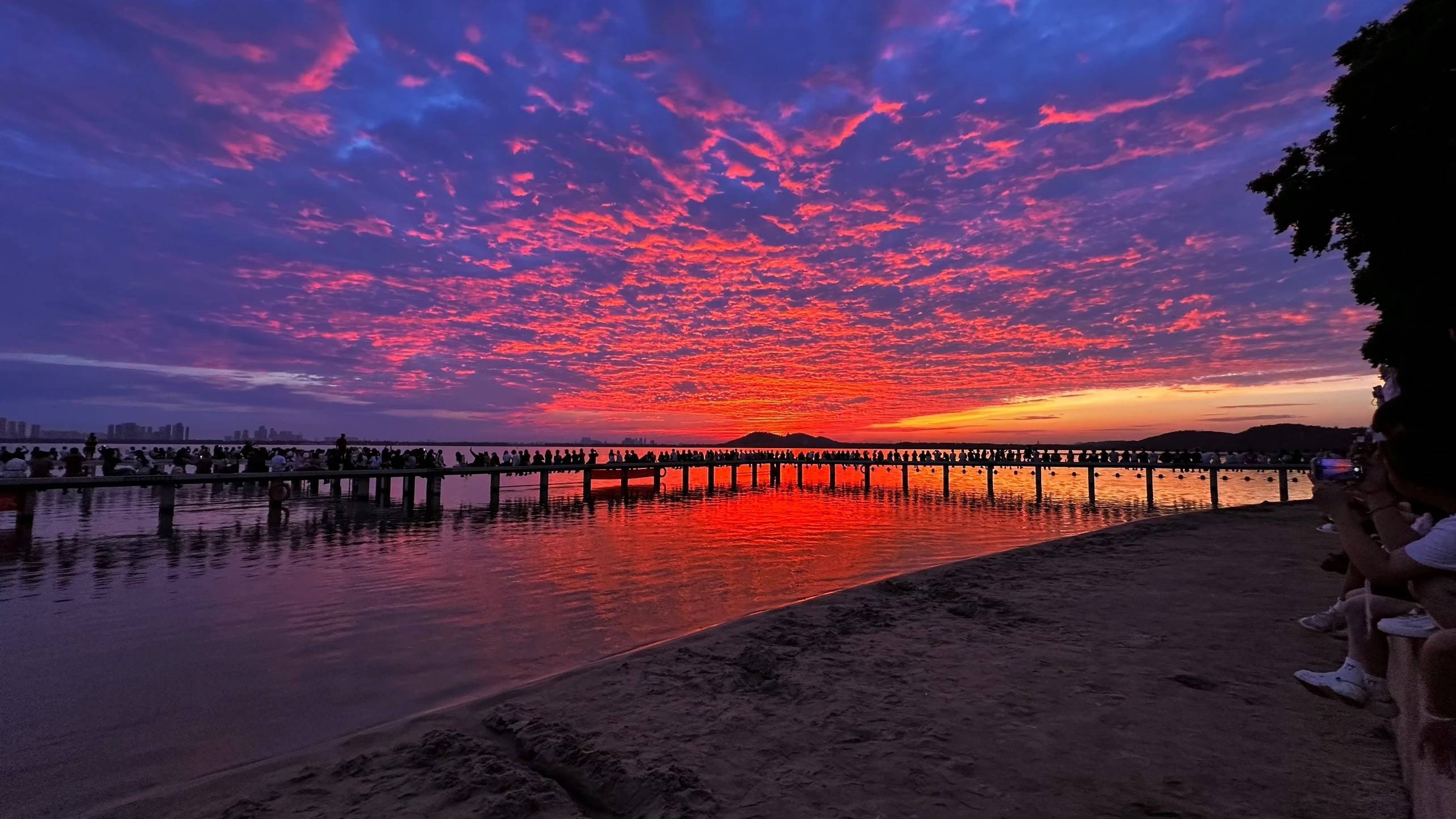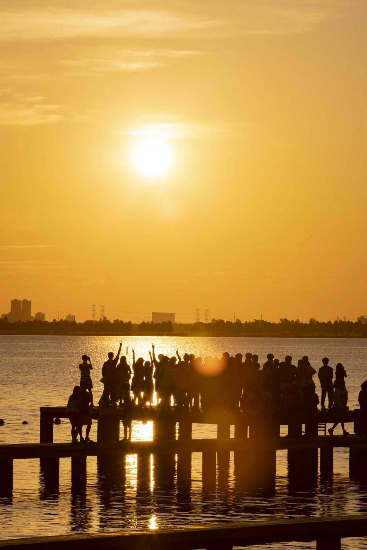 有网友记录了今夏来凌波门看“世纪朝霞”的感受:4时50分左右,先是天际线裂开一道金光,之后它像是被点燃的火焰,红的、橙的、粉的、金的……整片天空都在“燃烧”,湖水也被染成橘子海,手机拍不出它万分之一的美……5时30分,耳边的鸟鸣声逐渐清晰,湖畔开始冒出晨跑的人、踩水的小孩子……