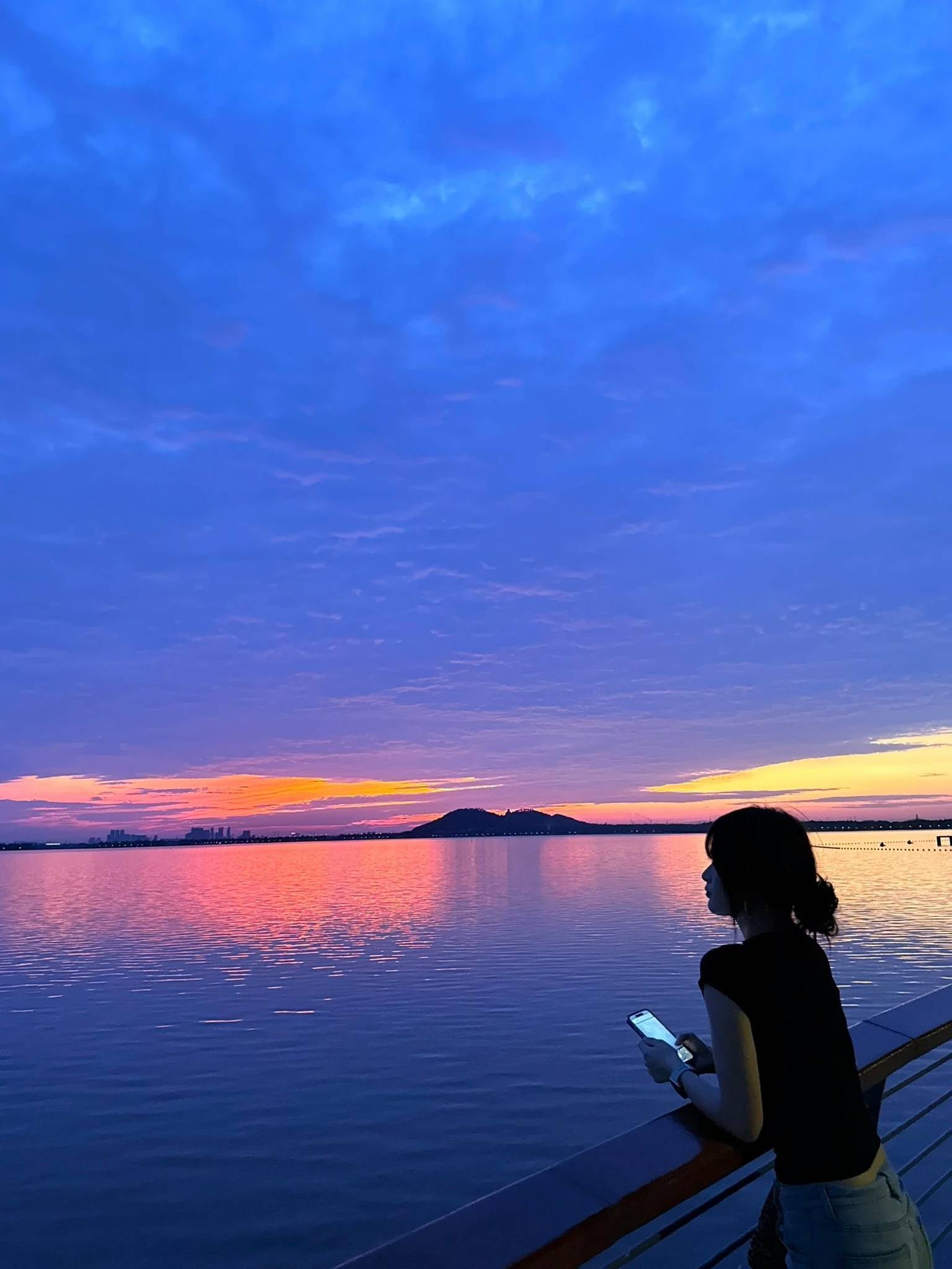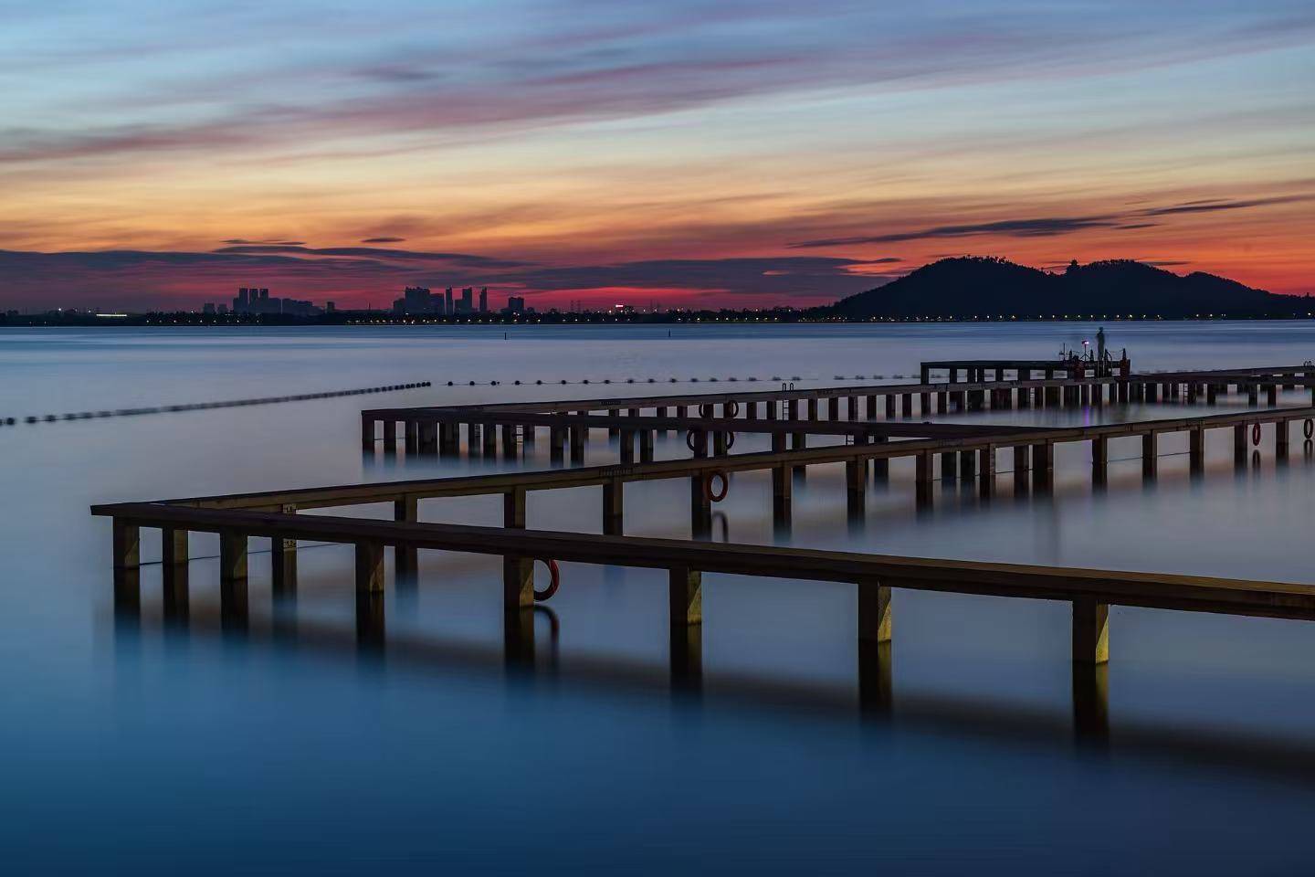 相比看日出,一部分人更爱它的“蓝调时刻”。蓝调时刻通常指日出前和日落后的半小时。此时,光线柔和,天空呈现出由浅入深的蓝色,浩渺开阔的东湖往往让人产生是海的错觉。黄昏过后,沿着湖面亮起的街灯、远方的城市霓虹与建筑剪影,又为这水天一色的蓝增添了电影镜头般的浪漫。不少人感慨,盛夏的武汉凌波门,让人仿佛置身于La La Land(电影《爱乐之城》中场景)。