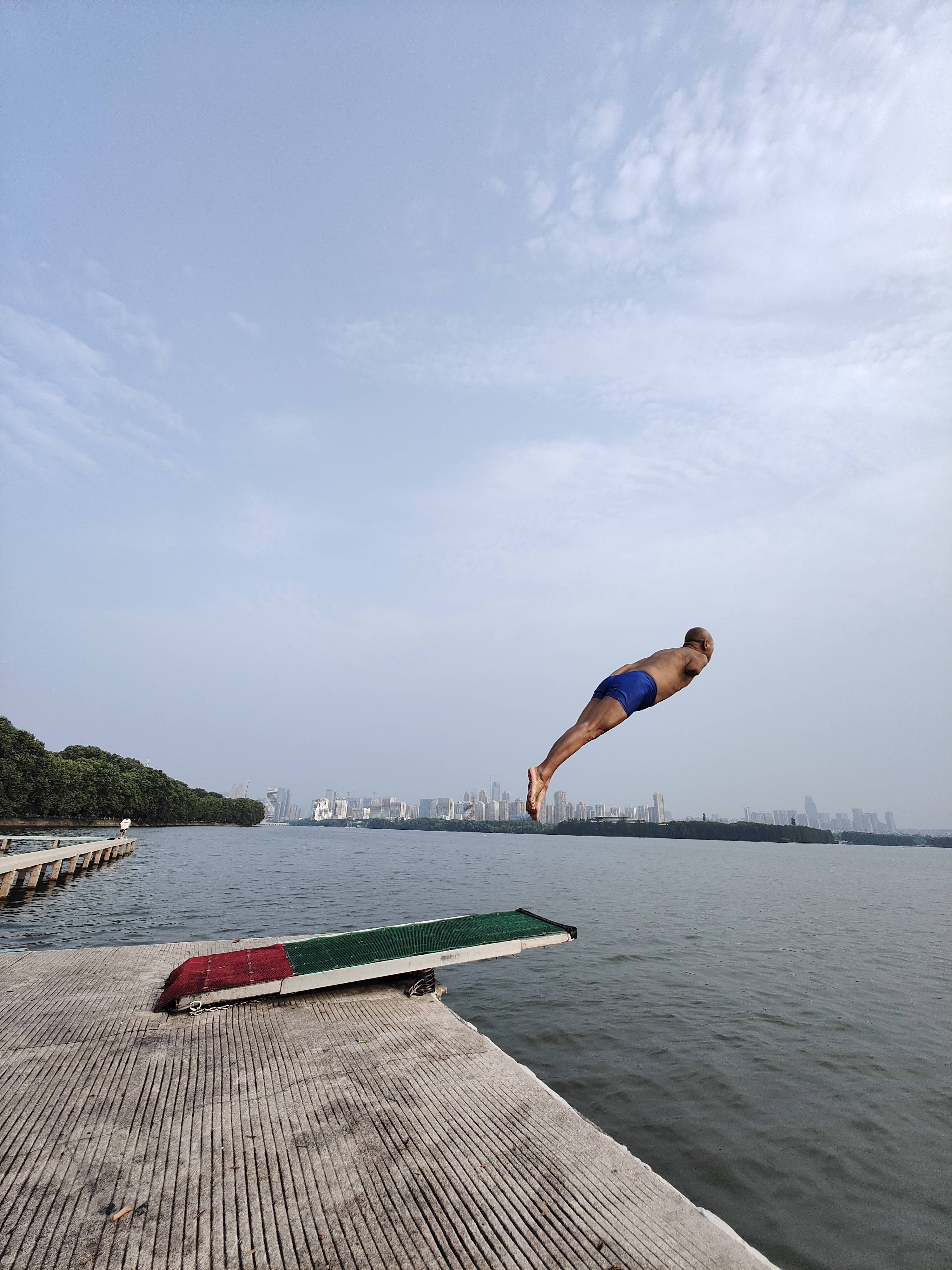 镜头记录下这群自称凌波门跳水队队员们的清晨。嘻嘻哈哈间,年龄在50岁上下的老哥们相互开着玩笑,“把气氛搞起来,三、二、一,跳!”随后以漂亮的“飞燕式”“镰刀式”动作跳入湖中,最后,人们齐声呼唤“一把手,来一个!”